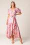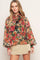 A printed woven top featuring high neckline, peasant sleeve with smocked cuff and front tie detail
