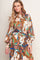 A printed woven top featuring a high neckline, blouson sleeve with cuff, and back neck tie closure.