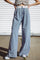 A washed denim pant featuring contrasting waist band, front pleat and zipper closure, side pocket, wide leg and back pocket
