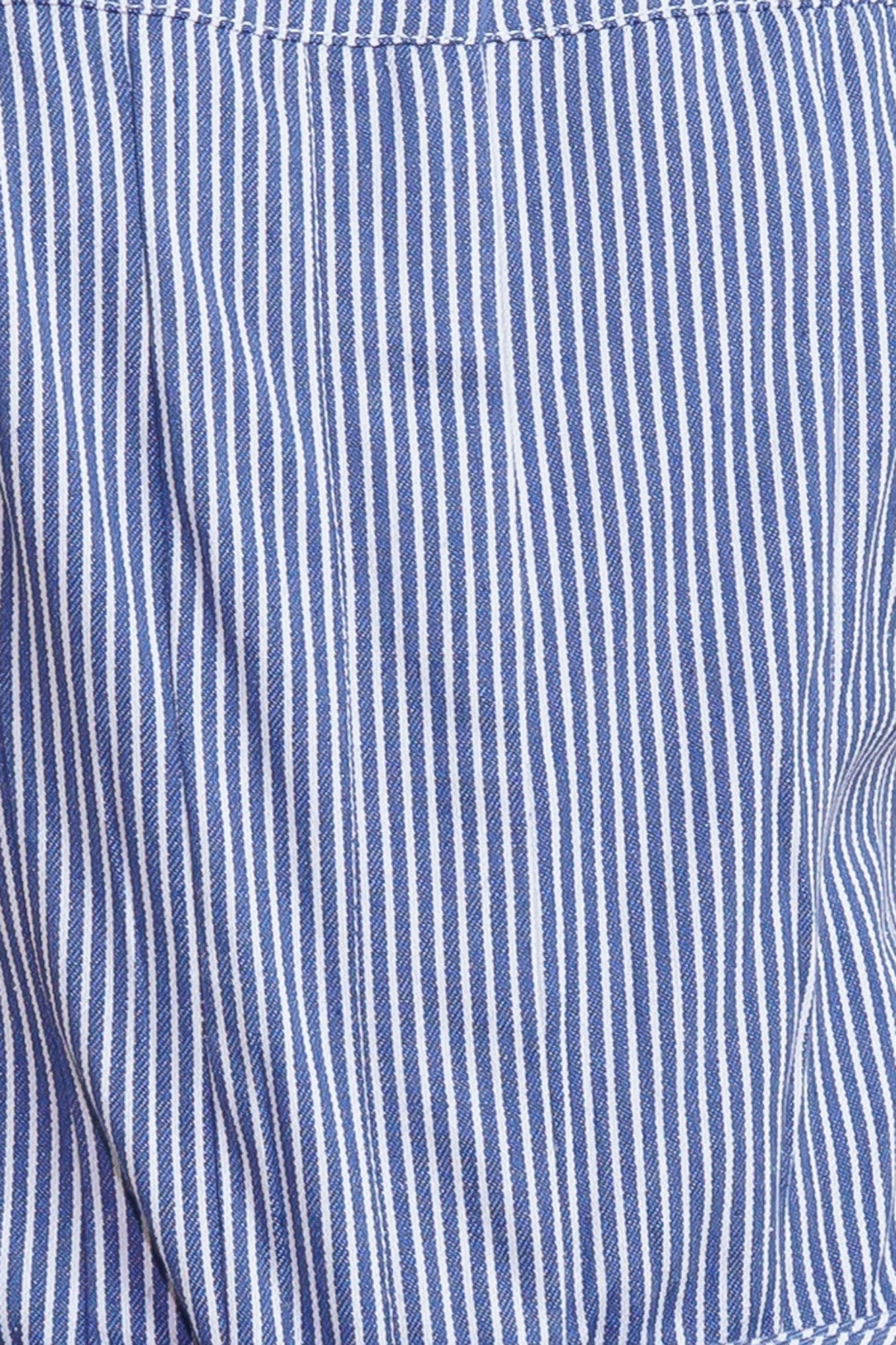 A striped woven jumpsuit featuring straight neckline, straps, front closure, self belt, side pockets and wide leg.