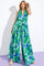 A printed woven jumpsuit featuring V halter neckline, sleeveless, self sash tie, wide leg, bare back with neck tie