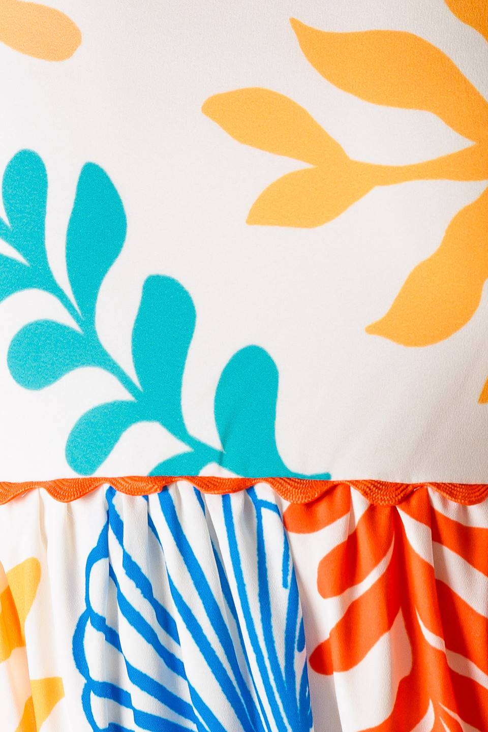 A printed woven maxi dress featuring straight neckline with ribbon edge, shoulder ties and smocked back bodice.