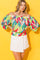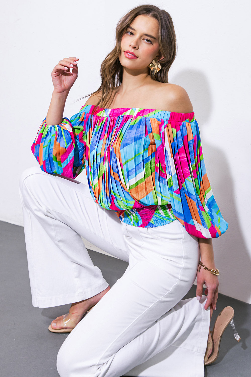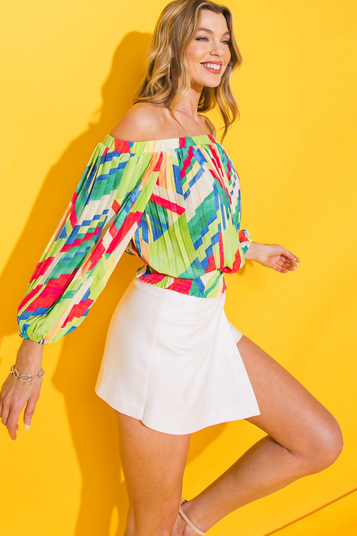 Experience the luxury of our printed woven top, complete with a chic off-the-shoulder neckline, elegant pleated body, and a sophisticated smocked waistband.