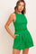 A solid green woven romper featuring round neckline, sleeveless, braided waist band, side pocket and back zipper closure