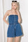 A washed denim romper featuring strapless, button down, side pocket, elasticized waist and cuffed hem.