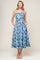 A printed denim midi dress featuring straight neckline, straps, full skirt and back zipper closure.