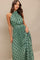A printed woven maxi dress featuring halter neckline with back bow tie, sleeveless, pleated skirt and elasticized back waistband