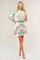 A printed woven mini dress featuring ruffled neckline with front tie, long sleeve, elasticized waist and ruffled hemline