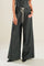 A striped denim pant featuring a high waist, front closure, side pockets, contrasting belt, and wide leg.