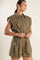 A solid olive woven romper featuring collar, oversize shoulder, front button down and zipper closure, self belt, side pockets and cuffed hemline.