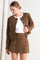 A faux suede cropped jacket featuring round neckline, long sleeve, front pockets and button down.