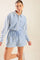 A striped woven romper featuring shirt collar, button down, long sleeve, elasticized waist with sash tie and side pockets