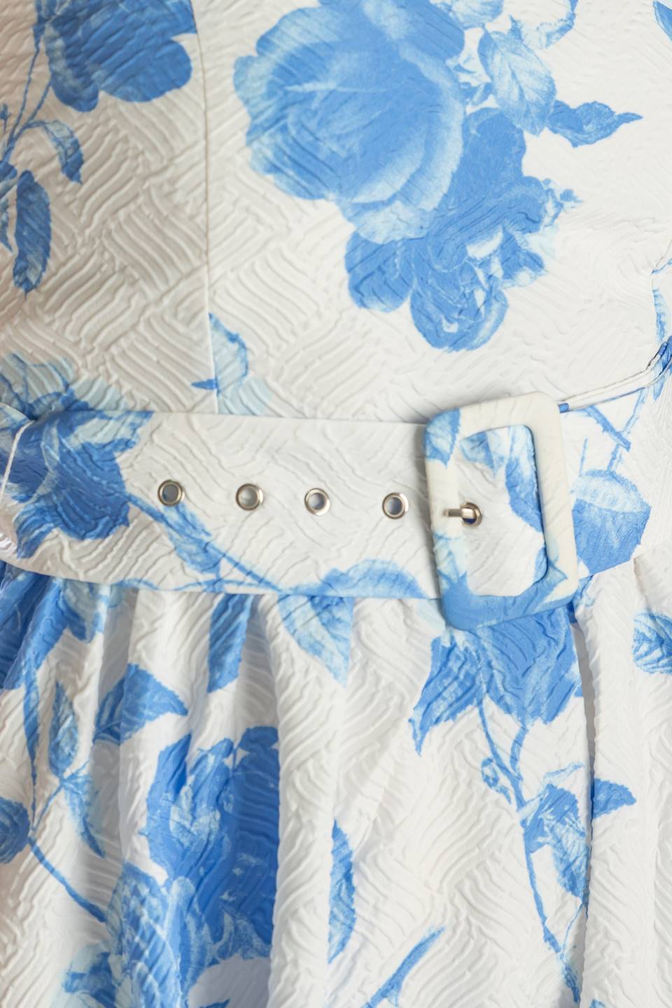 A strapless white and blue printed textured woven midi dress featuring self belt and full skirt.