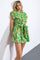 A printed woven romper with a collared shirt, button down, cuffed short sleeves, and an elasticized waist with a self sash tie.