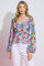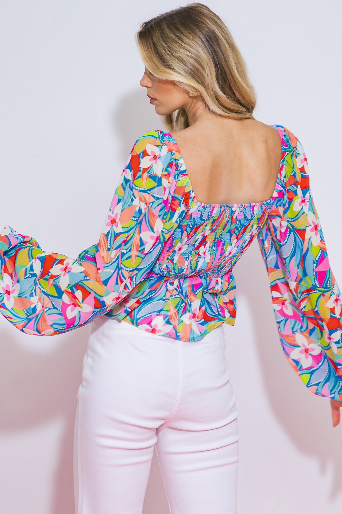 A printed woven top featuring sweetheart neckline, peasant sleeve, gathered center front, peplum and smocked back