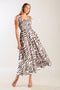 A printed woven midi dress featuring square neckline, short puff sleeves, smocked waistband, full skirt and ruffled hemline