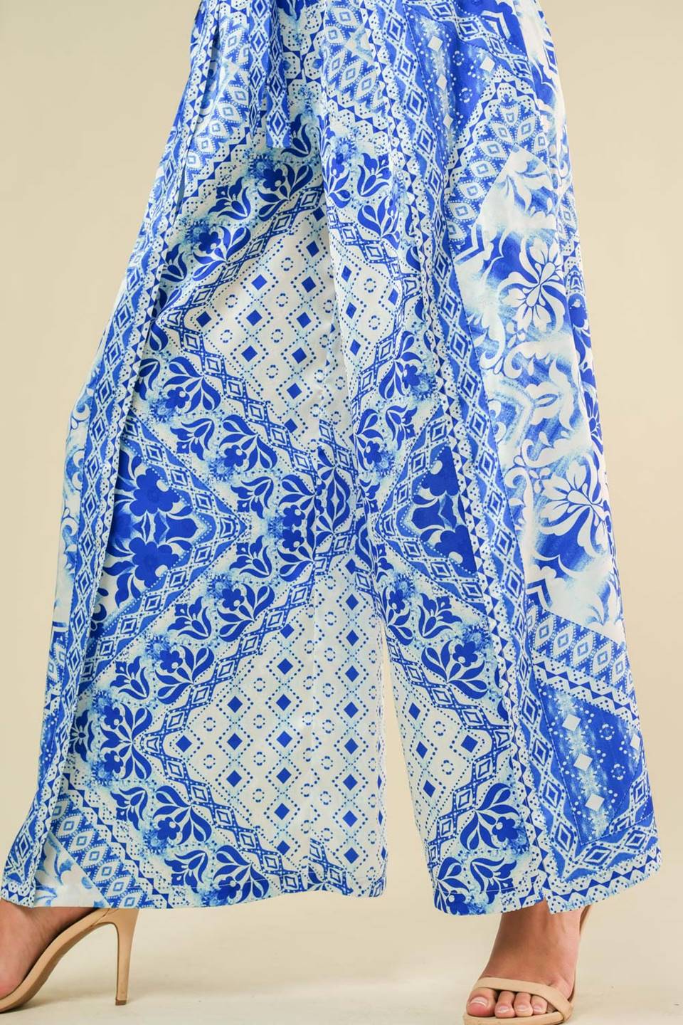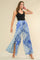 A printed woven pant featuring open side, front tie and elasticized back waist band. Matching top IT13104