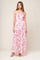 A pink and ivory, floral printed woven lace maxi dress featuring straight neckline with ruffled edge, straps, smocked bodice and tiered skirt.