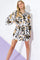 A printed woven romper featuring shirt collar, button down, dropped shoulder with kimono sleeve, elasticized waist with self sash tie