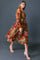 A printed woven organza midi dress featuring surplice neckline, long sleeve, full skirt and back zipper closure