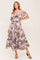 A printed woven midi dress featuring off shoulder neckline, flounce, elasticized waist with self sash tie and tiered skirt