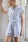 A woven romper featuring shirt collar, short cuffed sleeve, button down bodice, side pocket and short