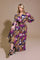 A printed woven midi dress featuring surplice neckline, long sleeve with cuff, full skirt and back zipper closure