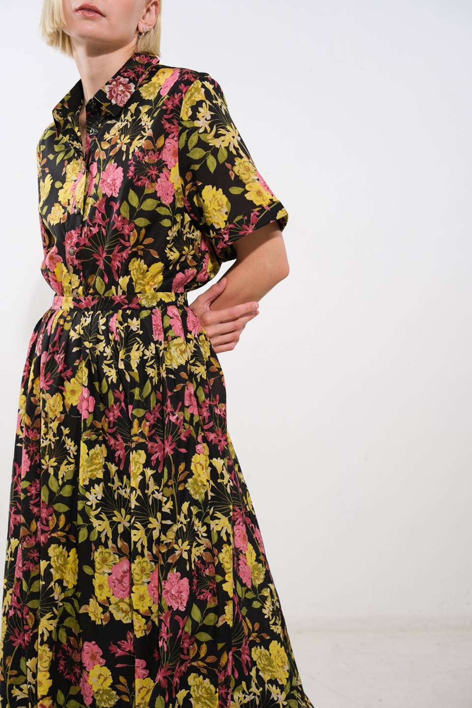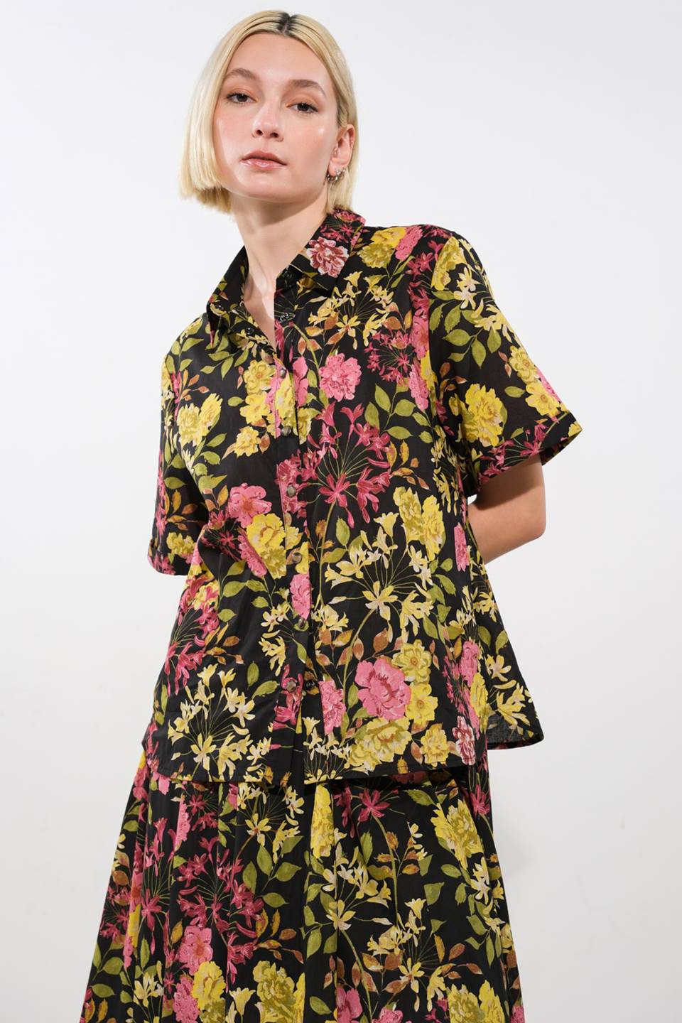 A printed woven button-down shirt. Matching skirt LOVE YOU MORE WOVEN MIDI SKIRT