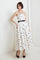 A printed textured woven midi dress featuring strapless neckline, contrasting belt, full skirt and back zipper closure