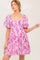 A printed woven eyelet mini dress featuring U neckline, short puff sleeve, smocked bodice and tiered skirt
