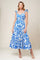 A blue and white printed woven midi dress featuring cami top with ruffle sleeve, elasticized wide waistband and tiered skirt.