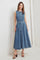 A washed denim midi dress featuring round neckline, sleeveless, button down, circle skirt and self belt