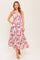 A printed woven midi dress featuring square neckline, sleeveless, circle skirt and back zipper closure.
