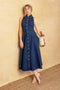 A solid woven pant featuring front closure, side pockets and wide leg.