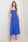A solid blue woven midi dress featuring straight neckline, straps, button down detail and smocked bodice