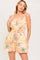 A printed woven romper featuring straight neckline, shoulder tie and smocked waistband