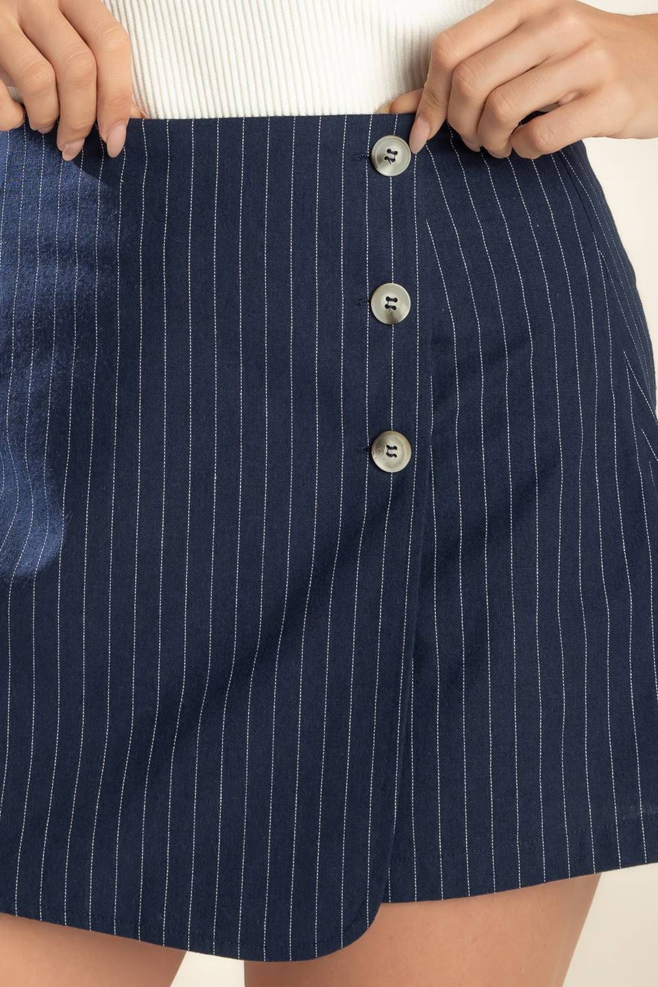 A striped woven skort featuring side button and zipper closure.