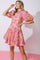 A printed woven mini dress featuring shirt collar, functional button down, short puff sleeve, full skirt and side zipper closure
