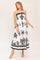 A strapless, white and black printed woven midi dress featuring full skirt and smocked back bodice