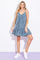 An acid washed mini dress featuring U neckline, straps, ruffled hemline and plunging back