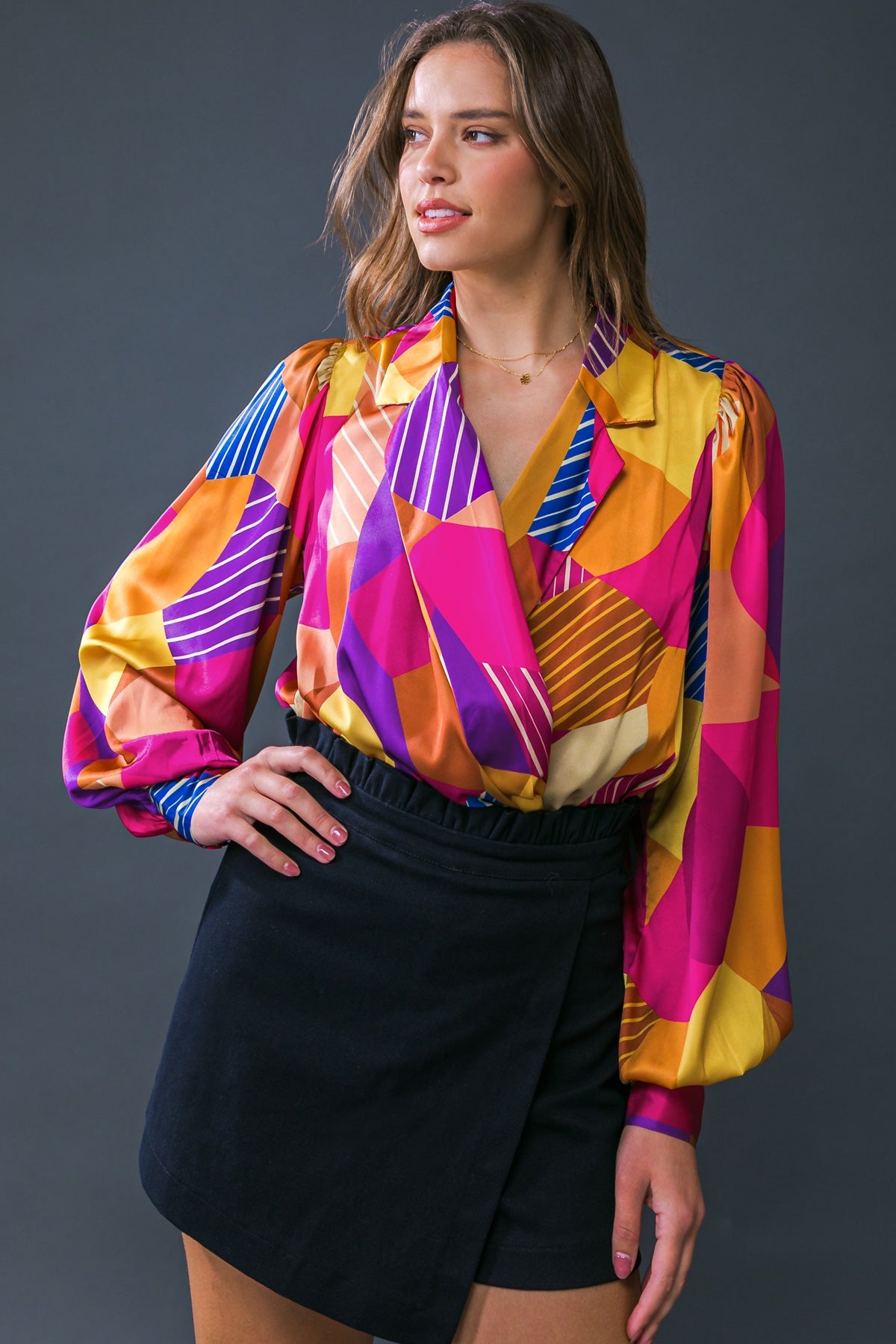 Introducing the NEW IN TOWN WOVEN BODYSUIT, a stylish addition to any wardrobe. Crafted from lightweight printed woven fabric, it features a blazer collar, long sleeves with cuffs, surplice neckline and mesh bikini with snap closure for added sophistication and convenience. Style your look and enjoy all-day comfort.