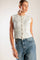 A white, sleeveless, sweater knit vest featuring round neckline and button down closure.