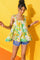 A printed woven top featuring straight neckline, wide strap and ruffled hemline.