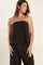 A solid black woven top featuring straight neckline, straps, side striped ribbon and back bow ties.