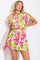 A printed woven romper featuring shirt collar, shirt collar, button down, short cuffed sleeve and elastic waist