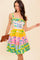 A printed woven mini dress featuring straight neckline, straps, tiered skirt and back zipper closure