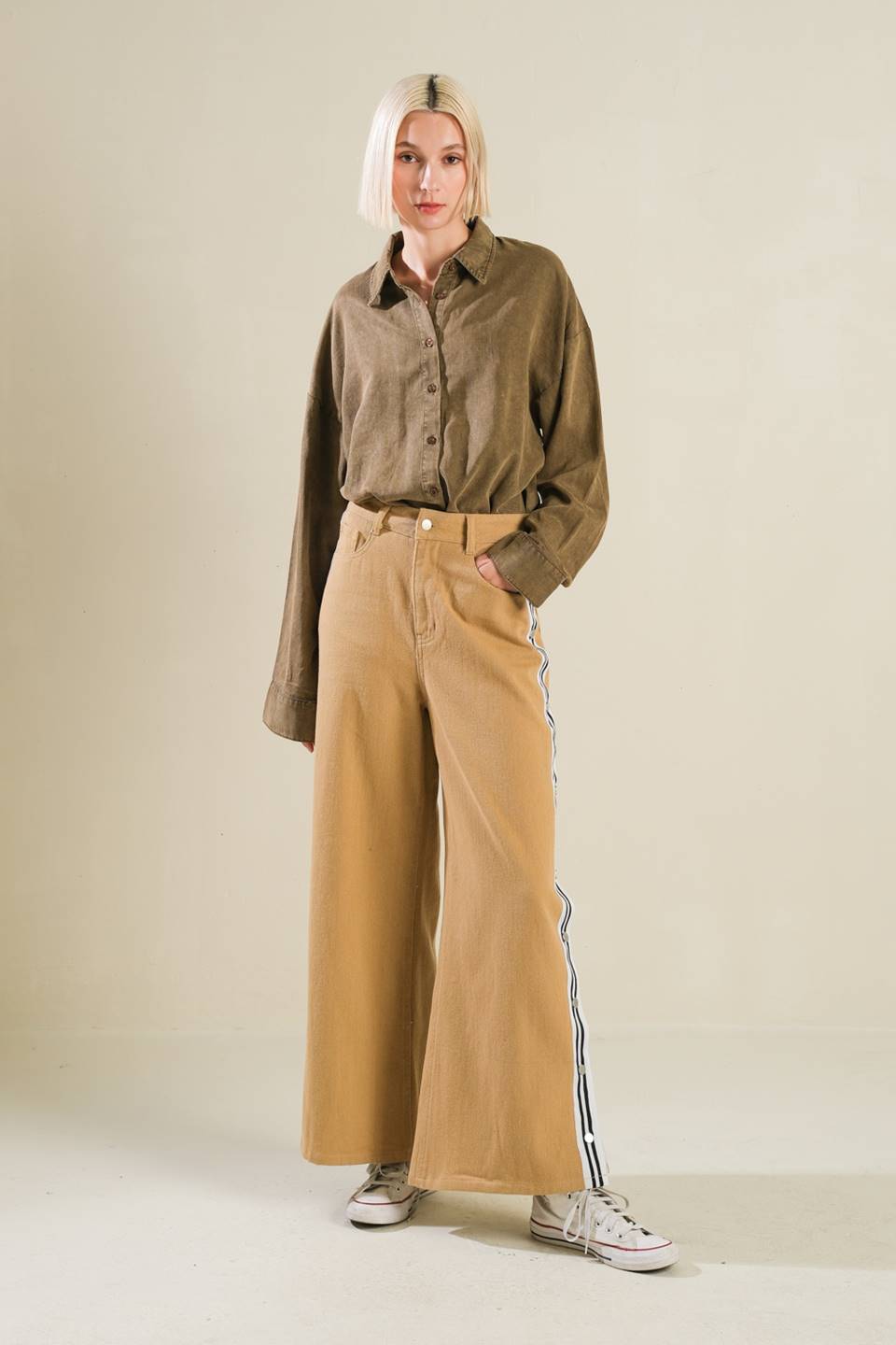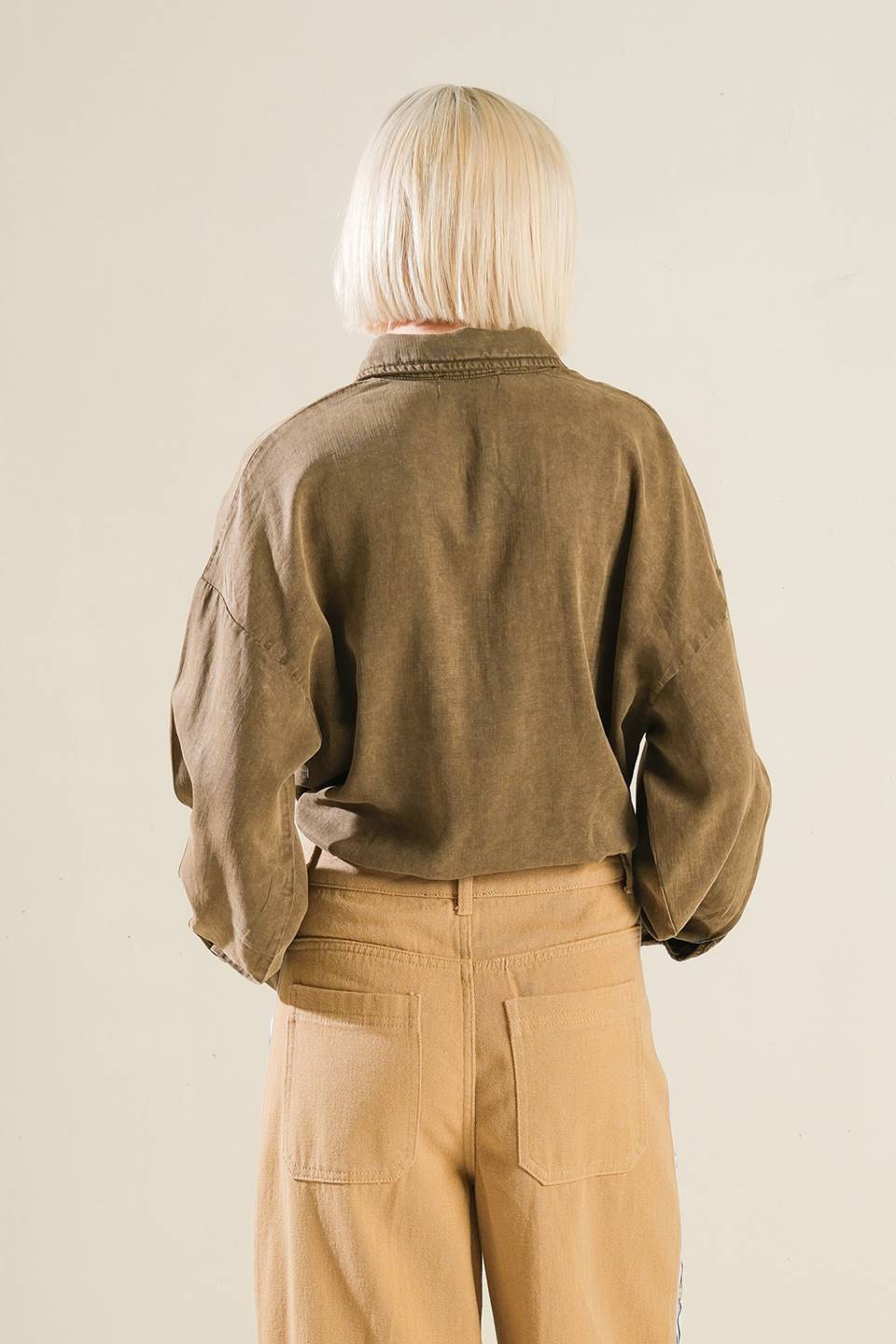 A solid woven bodysuit featuring shirt collar, button down, long sleeve and bikini with bottom snap closure