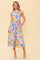 A printed woven midi dress featuring wide neckline, sleeveless, full skirt, bare back with tie and zipper closure