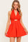 A solid red woven romper featuring halter neckline, front cut out and smocked back bodice