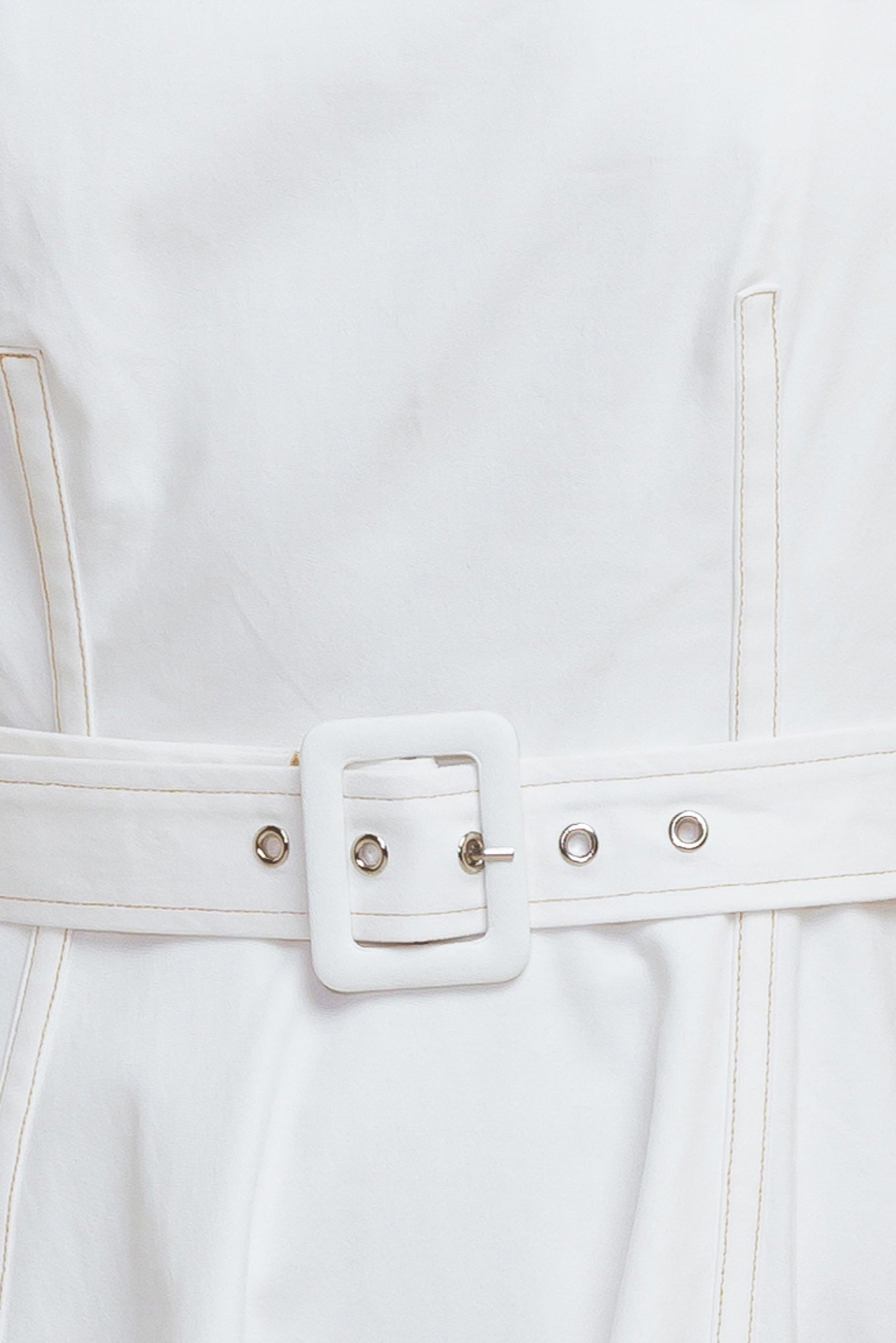 A solid white woven midi dress featuring round neckline, sleeveless, self belt, circle skirt with side hi-lo and back zipper closure